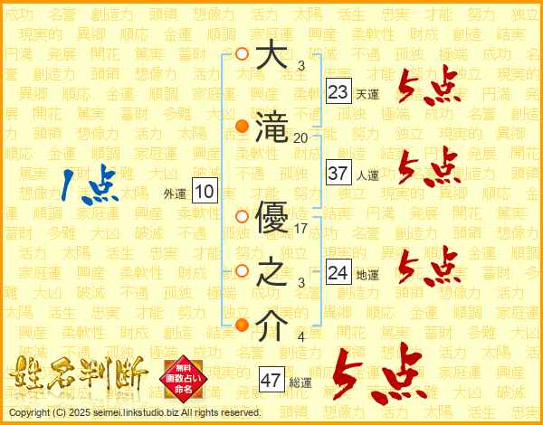 大(3画)滝(20画) 優(17画)之(3画)介(4画)