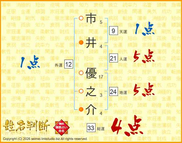 市井優之介さんの総運は33画の4点!