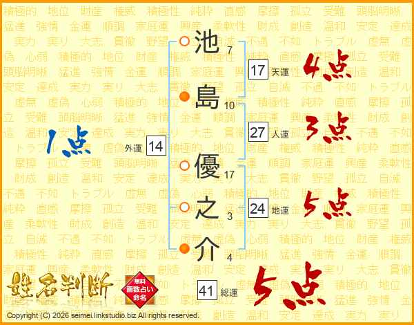 池(7画)島(10画) 優(17画)之(3画)介(4画)