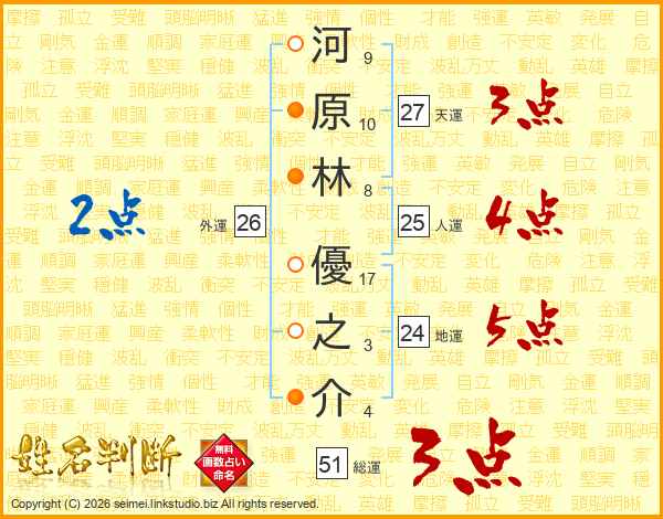 河(9画)原(10画)林(8画) 優(17画)之(3画)介(4画)