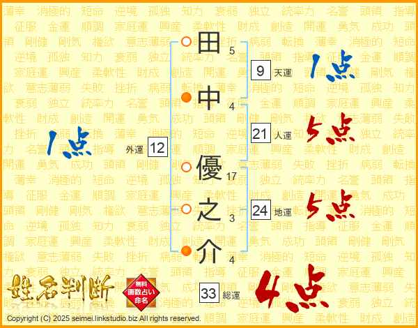 田(5画)中(4画) 優(17画)之(3画)介(4画)