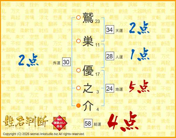 鷲(23画)巣(11画) 優(17画)之(3画)介(4画)