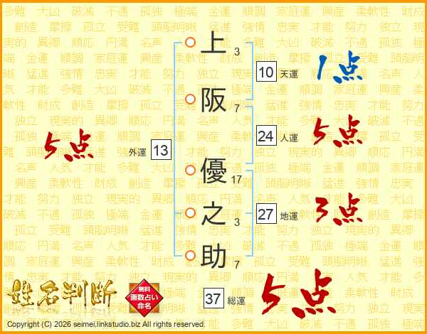上阪優之助さんの総運は37画の5点!