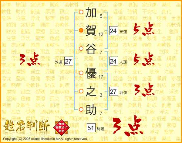 加(5画)賀(12画)谷(7画) 優(17画)之(3画)助(7画)