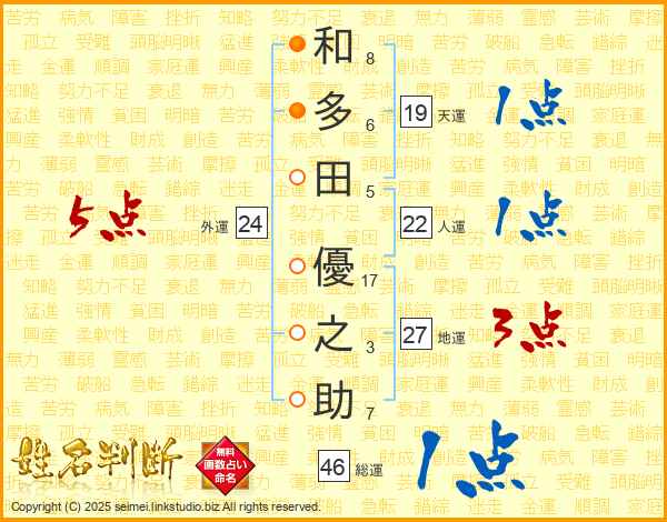 和(8画)多(6画)田(5画) 優(17画)之(3画)助(7画)