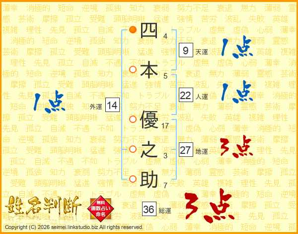 四(4画)本(5画) 優(17画)之(3画)助(7画)
