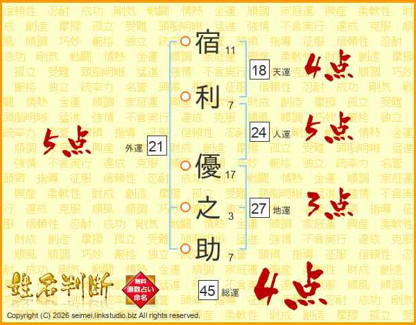 宿(11画)利(7画) 優(17画)之(3画)助(7画)