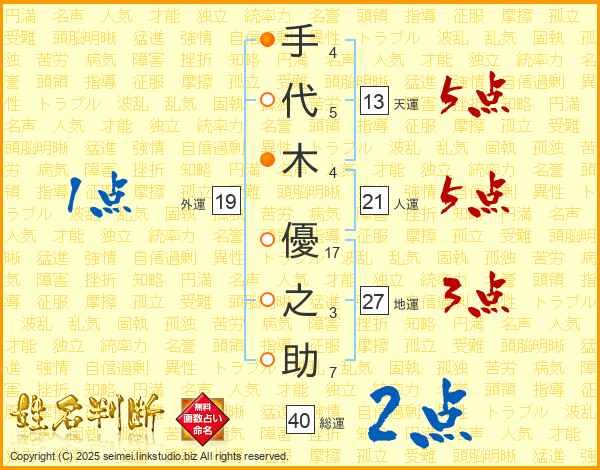 手(4画)代(5画)木(4画) 優(17画)之(3画)助(7画)