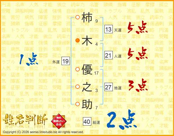 柿木優之助さんの人運は21画の5点!