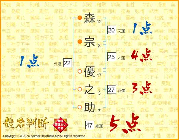 森(12画)宗(8画) 優(17画)之(3画)助(7画)