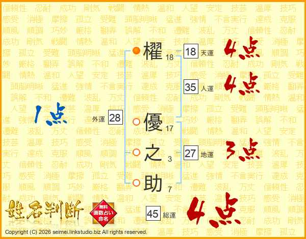 生活面を象徴する運勢です。外部から受ける影響力を表し、結婚運、家庭運や職場、環境への順応性を表します。総運から人運を引いた画数。姓や名が1文字の場合を除く。