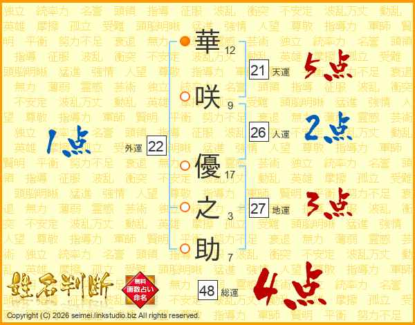 華(12画)咲(9画) 優(17画)之(3画)助(7画)