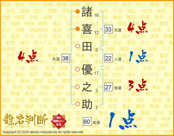 諸(16画)喜(12画)田(5画) 優(17画)之(3画)助(7画)