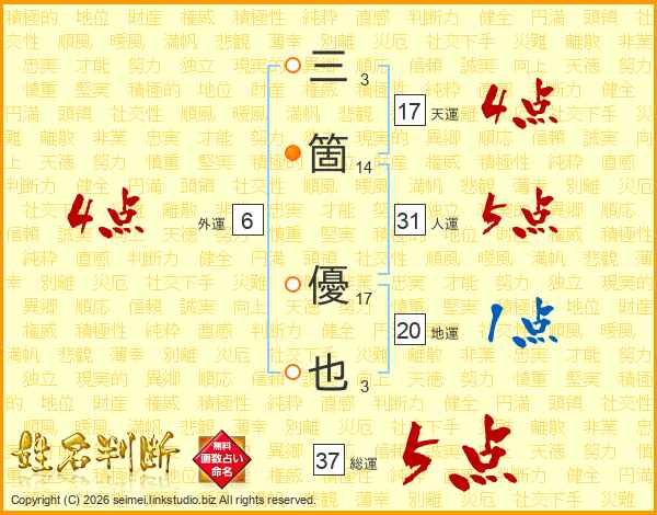 生活面を象徴する運勢です。外部から受ける影響力を表し、結婚運、家庭運や職場、環境への順応性を表します。総運から人運を引いた画数。姓や名が1文字の場合を除く。