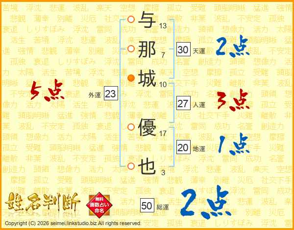 与(13画)那(7画)城(10画) 優(17画)也(3画)