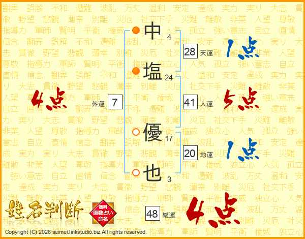 生活面を象徴する運勢です。外部から受ける影響力を表し、結婚運、家庭運や職場、環境への順応性を表します。総運から人運を引いた画数。姓や名が1文字の場合を除く。