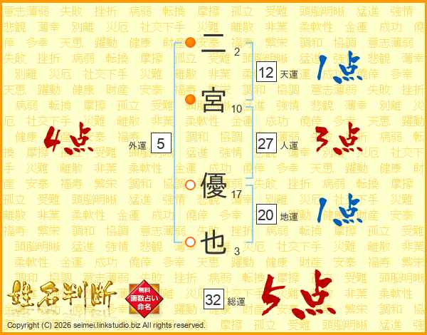 二宮優也さんの総運は32画の5点!