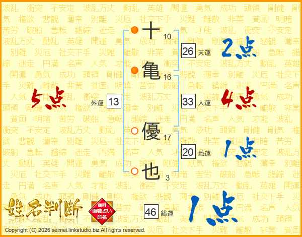画数の奇数(○陽)と偶数(●陰)の配列で吉凶を占います。どちらかにかたよる名前は大凶名で避ける必要があります。画数の奇数偶数。