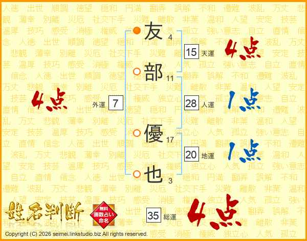 友部優也さんの総運は35画の4点!