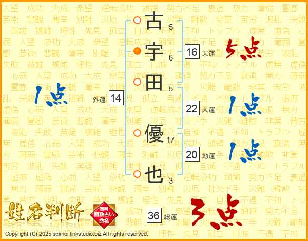古(5画)宇(6画)田(5画) 優(17画)也(3画)