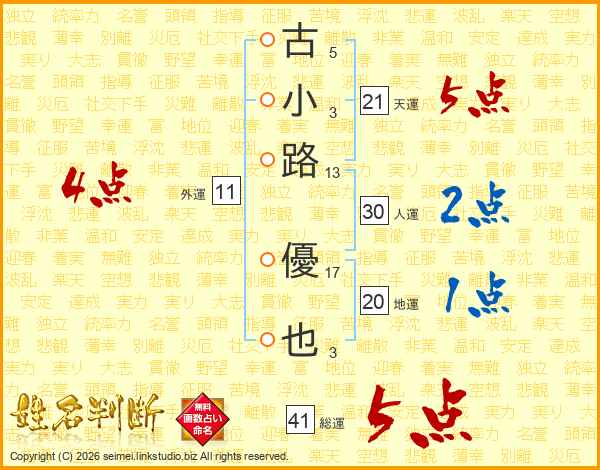 古(5画)小(3画)路(13画) 優(17画)也(3画)