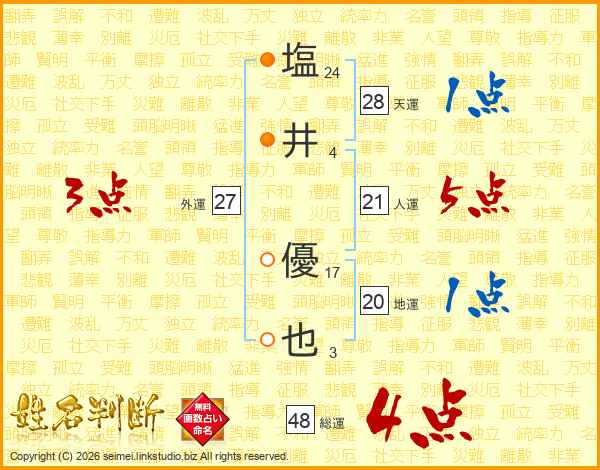 塩(24画)井(4画) 優(17画)也(3画)