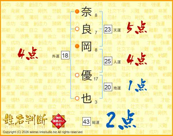 奈(8画)良(7画)岡(8画) 優(17画)也(3画)