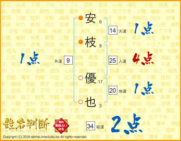 安枝優也さんの総運は34画の2点!