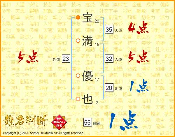 生活面を象徴する運勢です。外部から受ける影響力を表し、結婚運、家庭運や職場、環境への順応性を表します。総運から人運を引いた画数。姓や名が1文字の場合を除く。