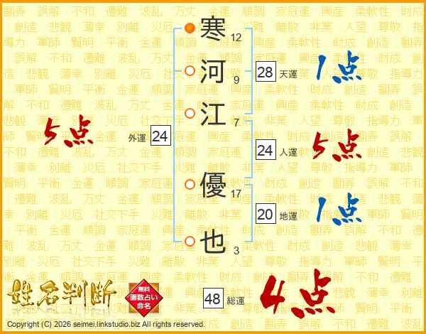 寒(12画)河(9画)江(7画) 優(17画)也(3画)