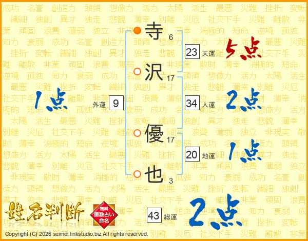 あなたの人生を表す1番重要な運勢です。生涯を通じて影響する総合運となり、主に50歳以降の晩年期に影響を及ぼします。苗字と名前の合計画数。