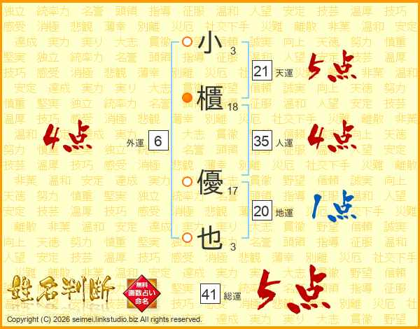 生活面を象徴する運勢です。外部から受ける影響力を表し、結婚運、家庭運や職場、環境への順応性を表します。総運から人運を引いた画数。姓や名が1文字の場合を除く。