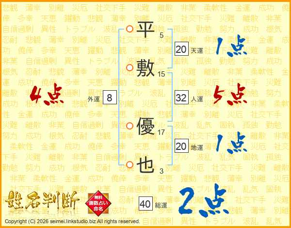 生活面を象徴する運勢です。外部から受ける影響力を表し、結婚運、家庭運や職場、環境への順応性を表します。総運から人運を引いた画数。姓や名が1文字の場合を除く。