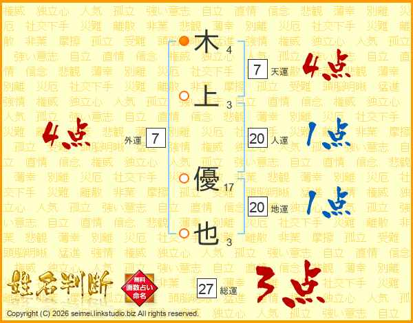 木(4画)上(3画) 優(17画)也(3画)