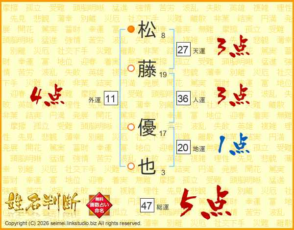 あなたの人生を表す1番重要な運勢です。生涯を通じて影響する総合運となり、主に50歳以降の晩年期に影響を及ぼします。苗字と名前の合計画数。