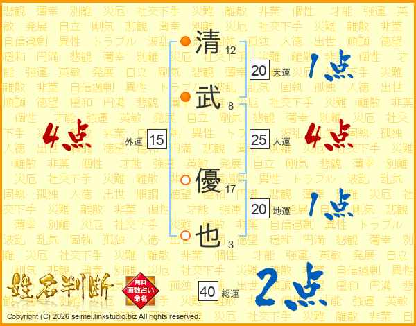 家系が持つ宿命的な運勢を表します。祖先から受け継いだ苗字ですので自分の力が及びません。家柄を象徴します。苗字の合計画数。