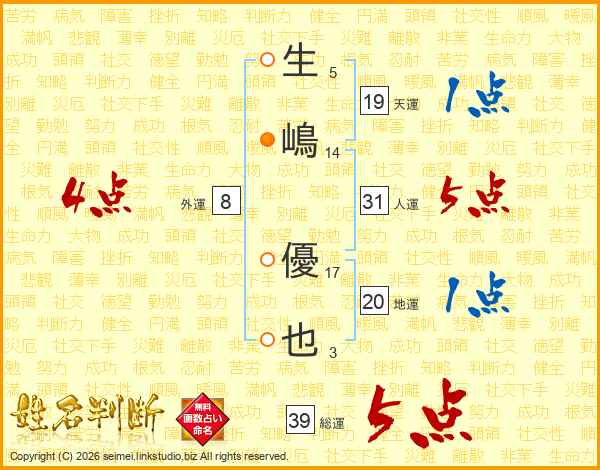 生嶋優也さんの総運は39画の5点!