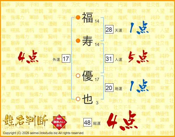 生活面を象徴する運勢です。外部から受ける影響力を表し、結婚運、家庭運や職場、環境への順応性を表します。総運から人運を引いた画数。姓や名が1文字の場合を除く。