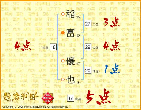 稲富優也さんの総運は47画の5点!