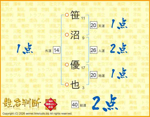 笹沼優也さんの総運は40画の2点!