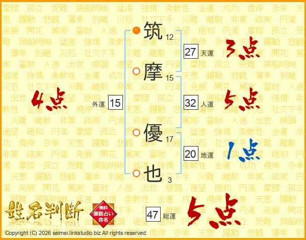筑摩優也さんの総運は47画の5点!