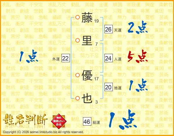 生活面を象徴する運勢です。外部から受ける影響力を表し、結婚運、家庭運や職場、環境への順応性を表します。総運から人運を引いた画数。姓や名が1文字の場合を除く。