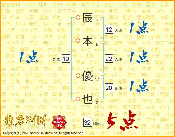 辰(7画)本(5画) 優(17画)也(3画)