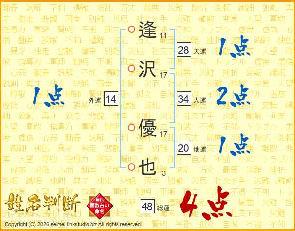 逢(11画)沢(17画) 優(17画)也(3画)