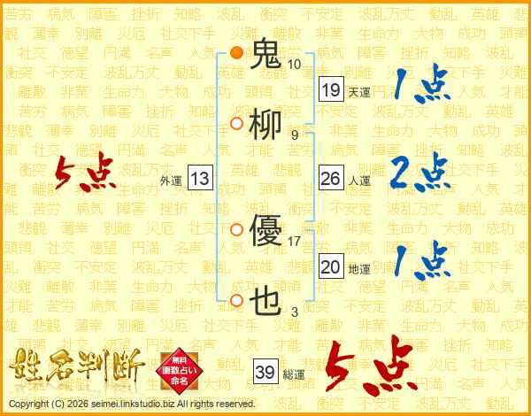 鬼(10画)柳(9画) 優(17画)也(3画)