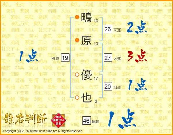 画数の奇数(○陽)と偶数(●陰)の配列で吉凶を占います。どちらかにかたよる名前は大凶名で避ける必要があります。画数の奇数偶数。