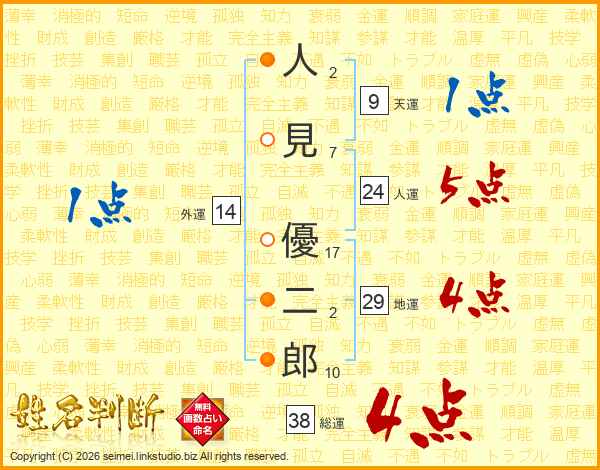 人(2画)見(7画) 優(17画)二(2画)郎(10画)