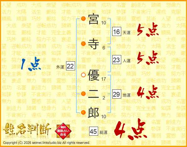 宮(10画)寺(6画) 優(17画)二(2画)郎(10画)