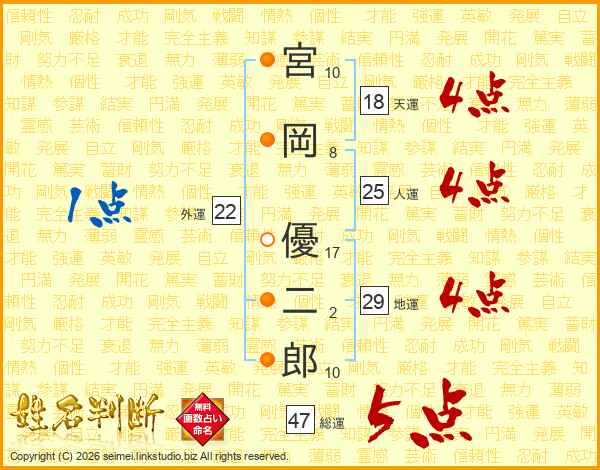 宮岡優二郎さんの総運は47画の5点!
