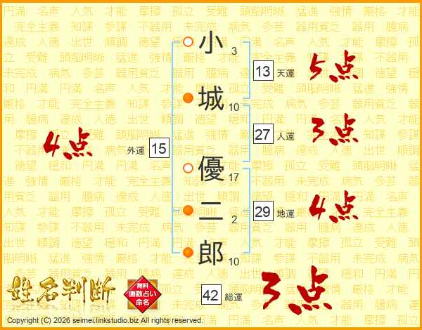 小(3画)城(10画) 優(17画)二(2画)郎(10画)